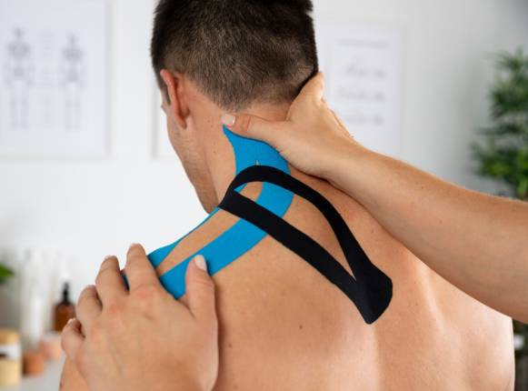 Taping is a technique to support muscles and joints, reduce pain and improve functional movement. It is commonly applied in sports rehabilitation, post-injury recovery, and for managing musculoskeletal conditions. Applying specialized adhesive tape to the skin in specific patterns depending on the condition.